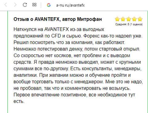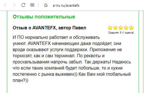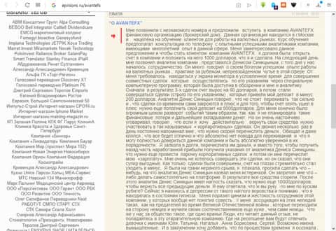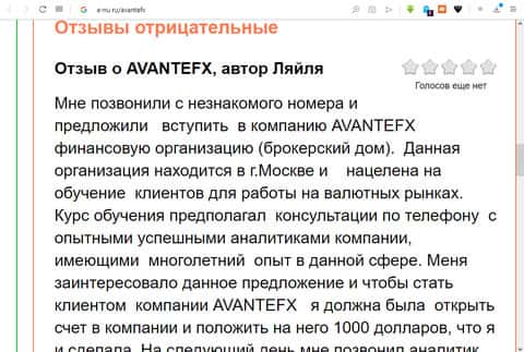 На портале a-nu ru пользователь под псевдонимом Ивана Андреевича оставил свой отклик, в котором называет контору Авант ФХ "золотой жилой". Он говорит, что это самый лучший брокер, который только может быть в наше время. Люди не ведитесь на подобный лохотрон. Берегите деньги и нервы! По словам этого "честного" брокера понятно сразу, что текст был написан не простым клиентом.