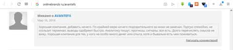 На сервисе onlinebrands находится очерк с криками о надежности и выгодности работы с порталом AvanteFX. Автор рассказывает о том, как он "поднялся" на этом сервисе. Да, многие поднялись на этом сервисе, те кто владеет этой конторой, афферисты и воры. В конце Вам даже предлагается зарегистрироваться по рефферальной ссылке, чтобы им шли деньги из вашего кармана.