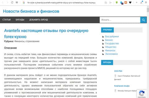 На сайте portalfir, находится статья, посвященная данному сервису. Отклики автора статьи льстивые и неправдивые, что в который раз доказывает всю продажность этих сайтов и попытку AvanteFX всё купить. На самом же деле, AvanteFX - это простая финансовая пирамида без каких-либо исключений, которыми наполнен интернет, но не понятно, почему с ними не борятся власти. Не ведитесь на лохотроны.