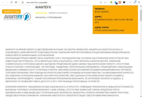 Контора данная довольно серьёзная, в том плане, что она позаботилась о том, чтобы на просторах интернета не гуляли отзывы реальных клиентов, которые потеряли свои деньги на данной бирже ценных бумаг. На сайте info-firm ru рассказывают о беснословной выгоде с сайта AvanteFX, которая не возможна даже, если на сайте одна правда. То есть статья заказана и цифры взяты "с неба".