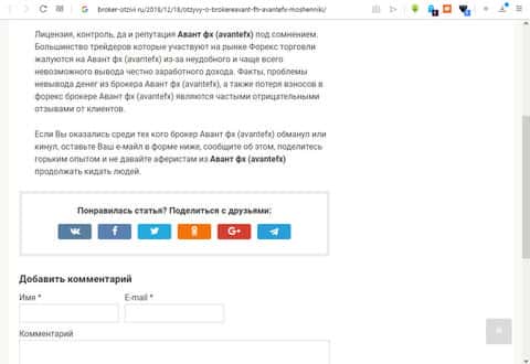 Отзывы о брокере Авант ФХ на сайте broker-otziviВ интернете, в социальной сети Твиттер, создана страница конторы жуликов, обворовывающих обычных людей-клиентов через свою мошенническую схему, в которой задействовано множество сайтов с подкупными статьями, о которых говорилось ранее. Владельцая этих сайтов должно быть стыдно, ведь, помогая компании жуликам, вы обворовывайте своих клиентов, снимая последние штаны с трусами с них.