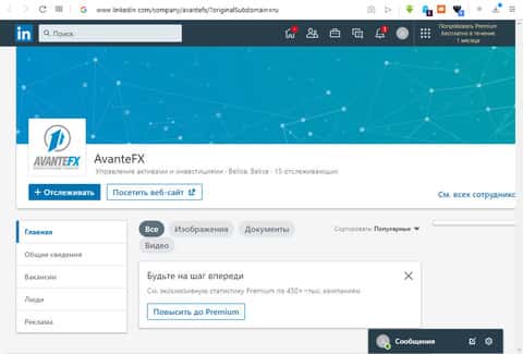 В социальной сети LinkedIn, довольно популярной в глобальной сети интернет, создана группа нашей конторы АvanteFX, которая постит на своей странице множество записей с финансовыми новостями, которые имеют отношение к брокерству. Написание постов тут, конечно, очень редко происходит, в среднем - это один пост в месяц, если не растянуть один пост на два месяца.