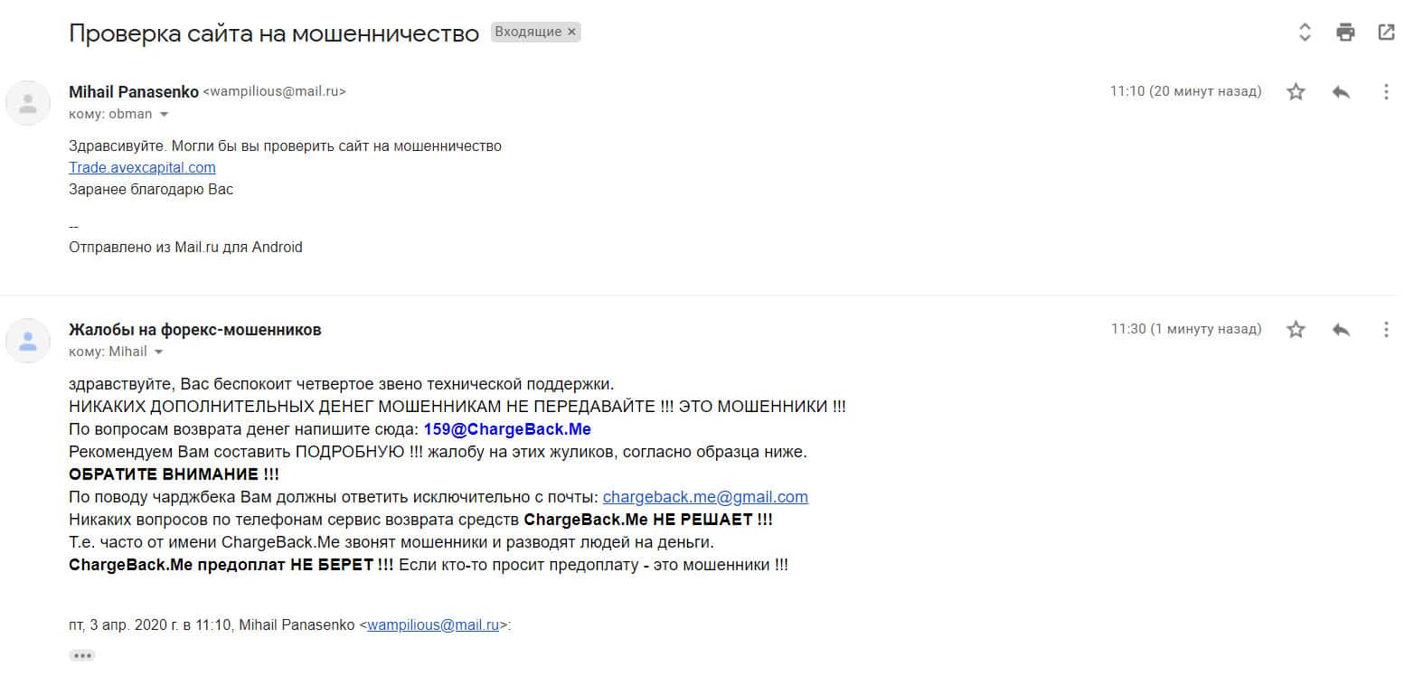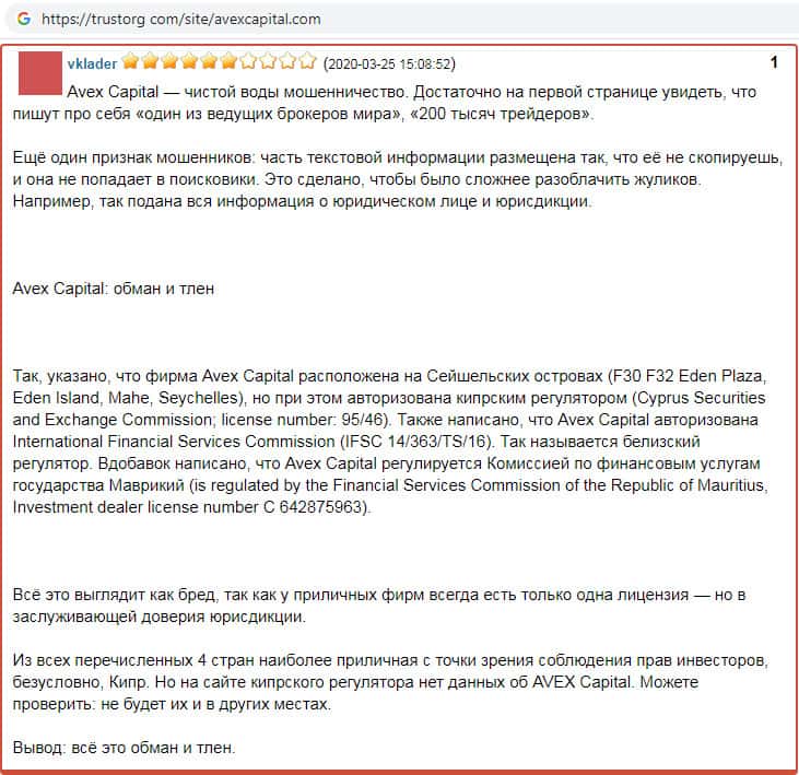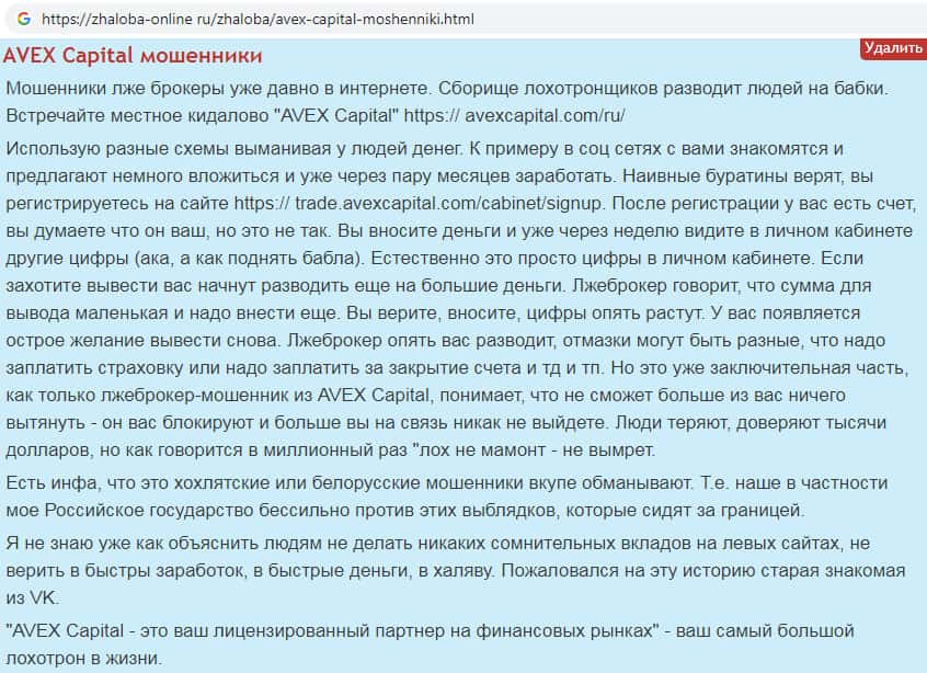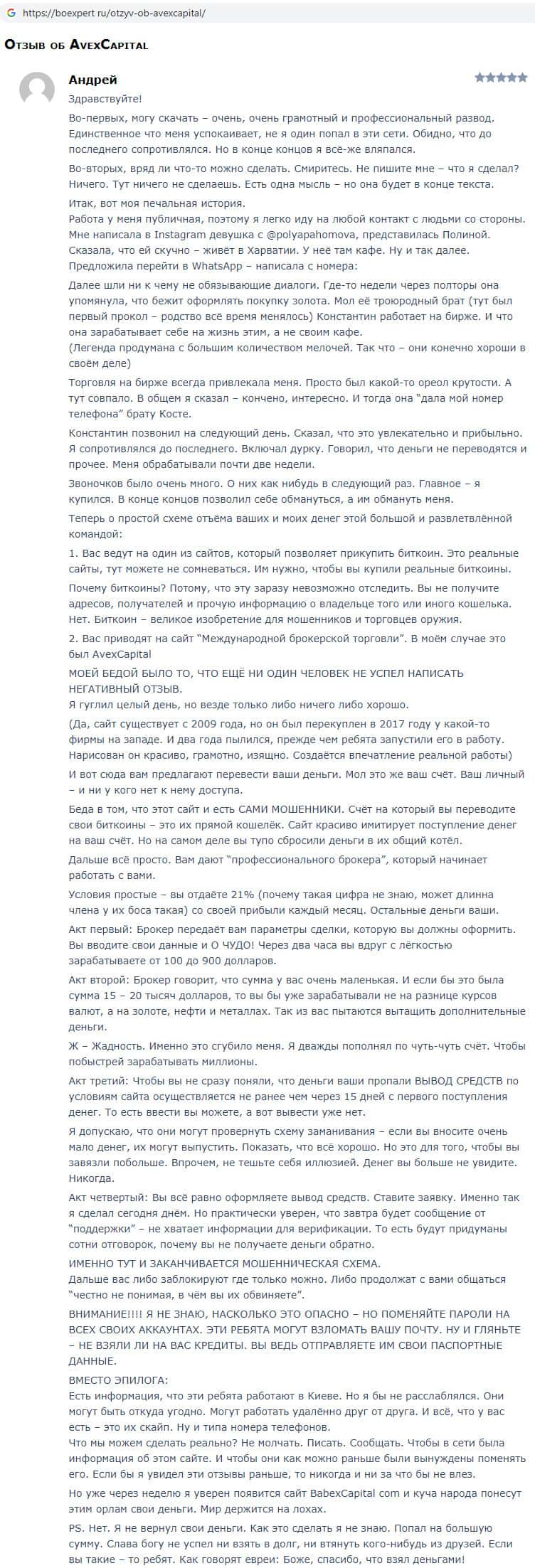 Н веб-портале боэксперт ру отыскан отзыв о разводе со стороны скам-брокера AvexCapital, автор которого некий Андрей пишет о том, что мошенники по отношению к нему так же использовали манипулятивные техники так же через социальные сети. Пользователь так же повелся на развод с их стороне, после чего потерял свои вложенные деньги.