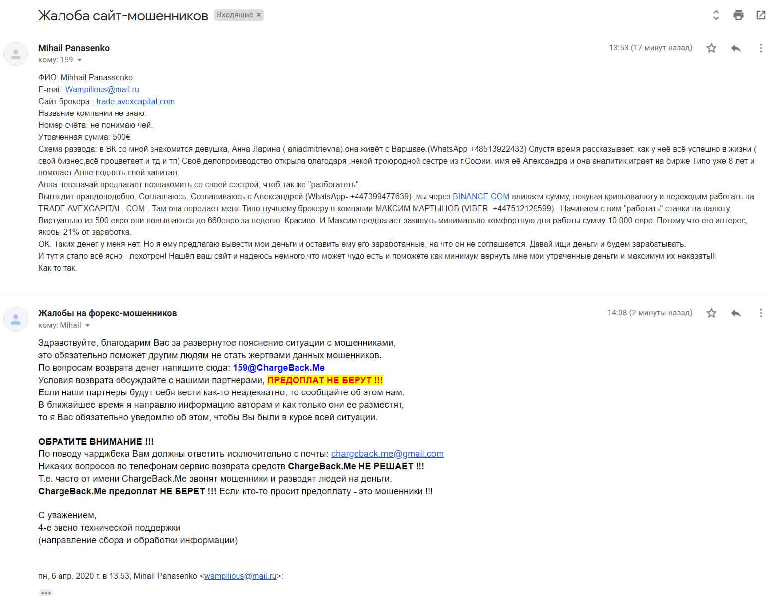Далее предлагаем вашему вниманию информационный материал в виде детальной жалобы на скаммерскую контору Авекс Капитал, которая опрокинула человека на 500 евро. В письме пострадавший пользователь указал лица тех, кто принимал участие в данной разводе на деньги, также стоит отметить то, что криптовалютная биржа Бинанс, являясь по сути еще одной веб-площадкой разводил была задействована в сей схеме.