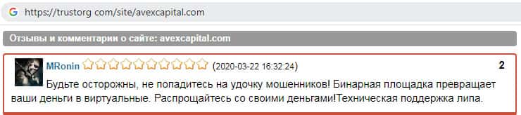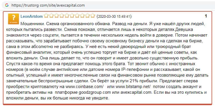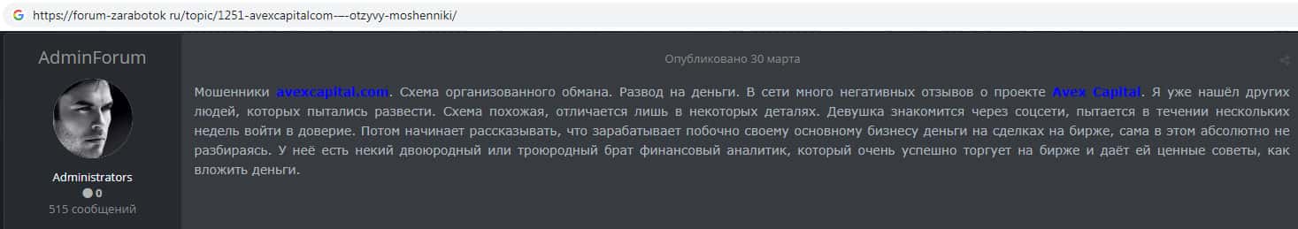 На онлайн-ресурсе трусторг ком замечен отзыв о жуликах AvexCapital. Автор данного отзыва пишет о том, что мошенники регистрируются в социальных сетях под чужими именами и после знакомства начинают рассказывать о том, что зарабатывают немалые суммы денежных средств на сайте псевдо-брокерской компании Авекс Капитал.