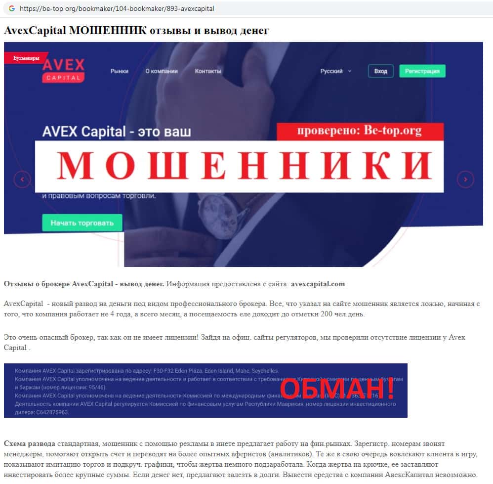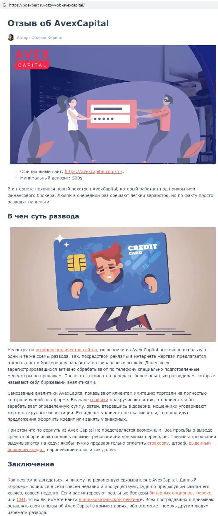 На информационном сайте boexpert ru найдена статья об интернет-лохотроне Авекс Капитал, представители которого обещают людям легкий заработок в интернете, а по сути это развод на деньги. Мошенники AvexCapital обещают заработок на международном финансовом рынке, к которому не имеют никакого отношения.