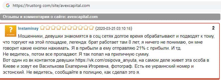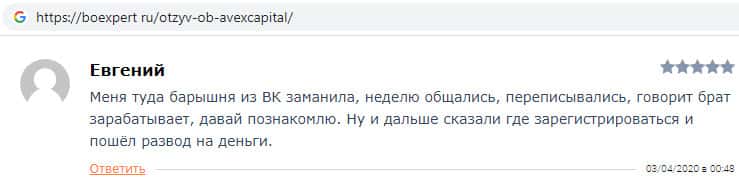 На веб-ресурсе boexpert ru обнаружен отзыв о скам-организации Авекс Капитал, автор которого некий Евгений так же пишет о том, что его на мошеннический сайт заманила девушка, которая добавилась к нему в друзья через российскую социальную сеть Вконтакте и начала вешать лапшу на уши о том, что якобы ее брат зарабатывает на сайте компании AvexCapital.