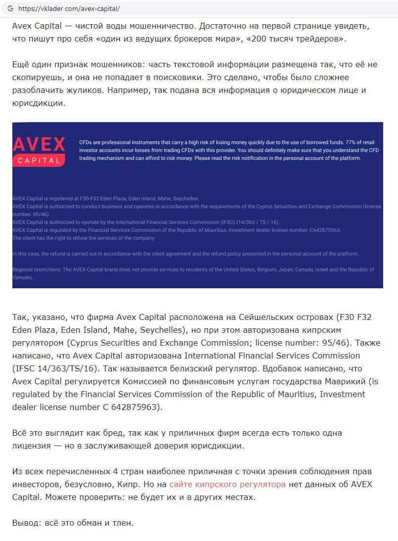 На веб-сервисе vklader com замечена статья о мошенниках AvexCapital, информация на сайте которых не имеет никакого отношения к настоящей деятельности компании. У надежной организации не может быть три регулятора и две лицензии. На сайте кипрского регулятора нет информации о псевдо-брокерской конторе Авекс Капитал.