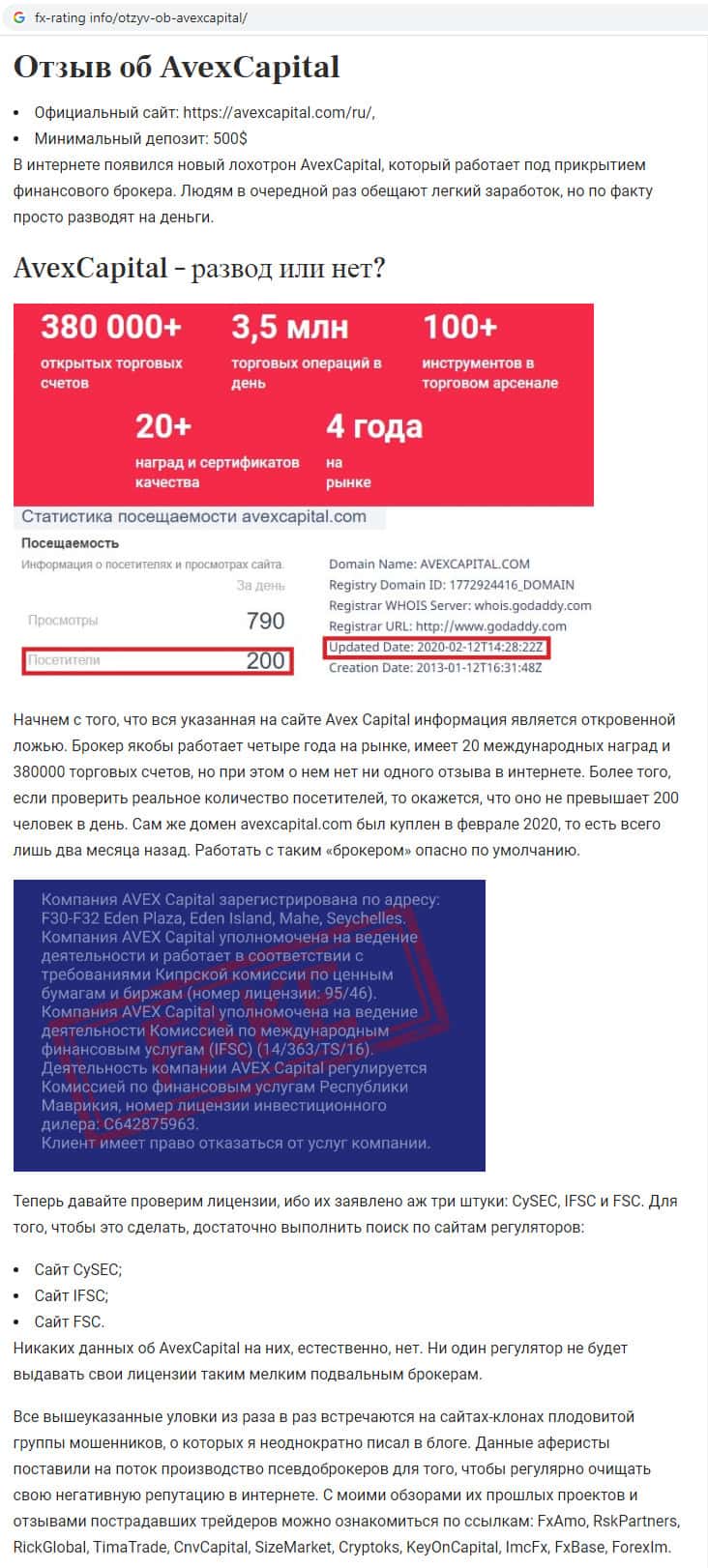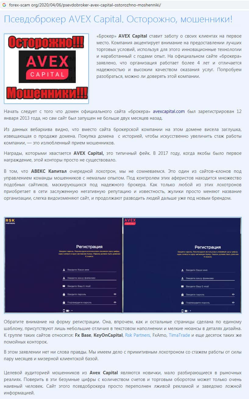 На веб-портале форекс-скам орг обнаружена статья-отзыв о мошеннической организации Авекс Капитал. Данный интернет-лохотрон рассчитан на неопытных трейдеров, а именно новичков. После того, как в интернете появляется слишком много негативной информации, аферисты сразу же начнут менять название своей конторы.