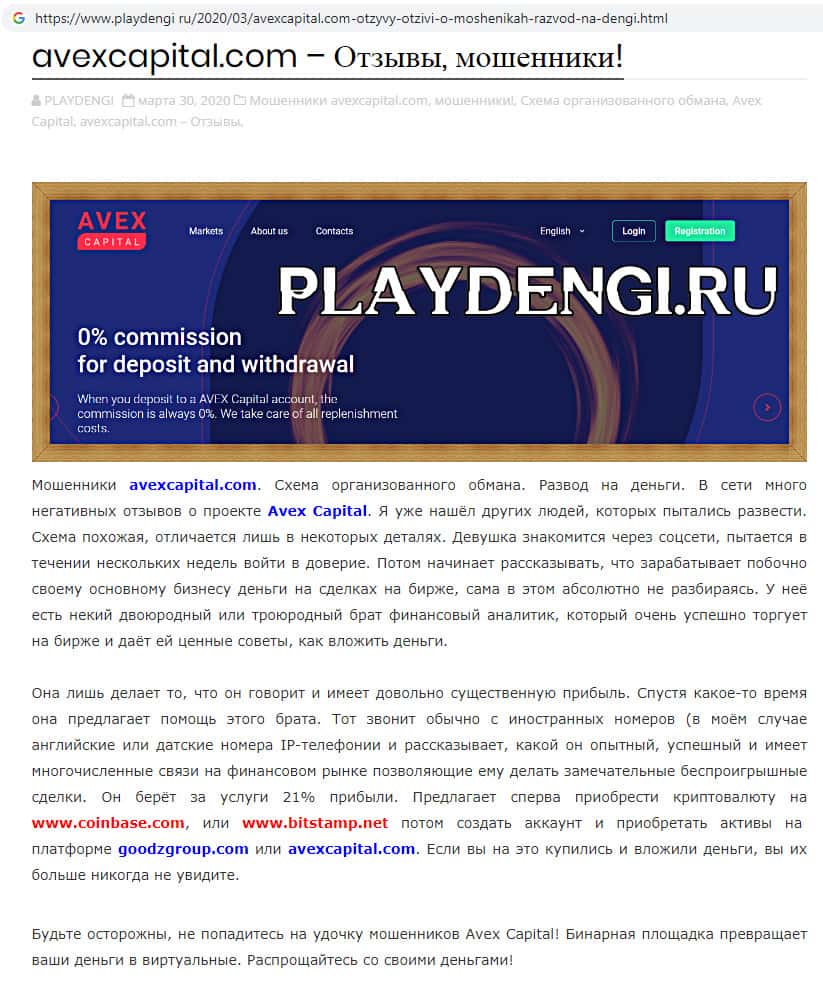 На веб-ресурсе playdengi ru замечена статья о скам-брокере AvexCapital, который выдает себя за лидера в сфере брокерских услуг, но на самом деле таким не является, потому что в глобальной сети интернет достаточно пользовательских отзывов, которые написаны людьми, которые связались с мошенниками и остались в итоге ни с чем.