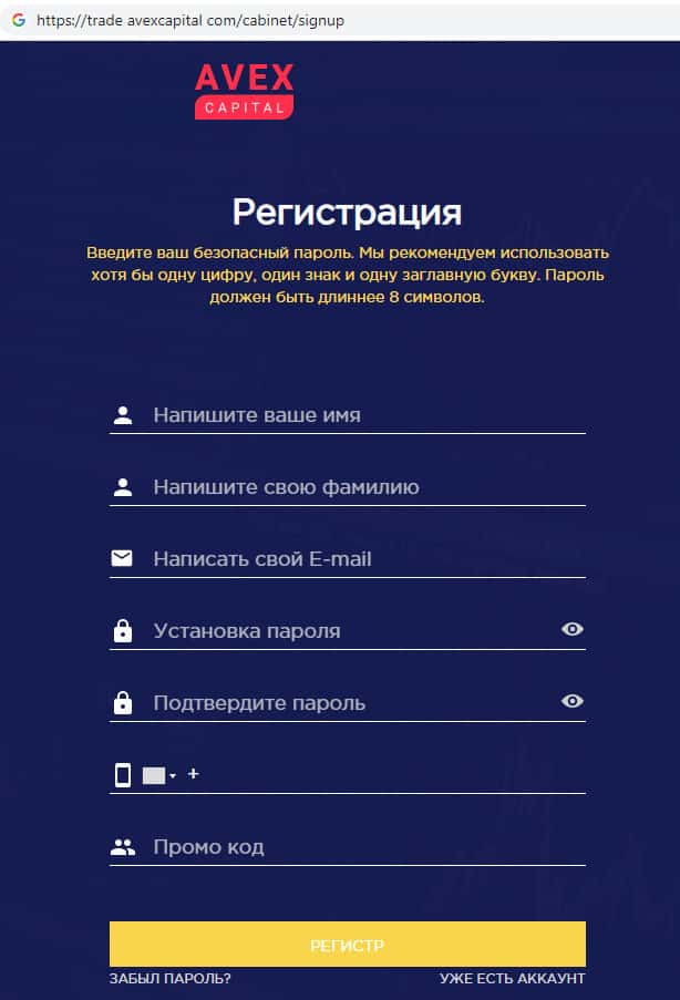 Для того, чтобы зарегистрироваться на сайте шулеров AvexCapital необходимо назвать имя, фамилию, адрес электронной почты, номер контактного телефона, пароль, и конечно же подтвердить то, что Вы соглашаетесь с условиями пользования сайтом. Прежде чем поставить галочку в данной форме, подумайте стоит ли так рисковать своими деньгами?