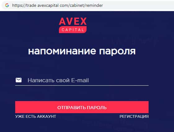 Ваши личные данные на сайте жульнической организации Авекс Капитал никак не защищены, поскольку для входа в кабинет необходимо указать только адрес электронной почты и пароль, которые очень легко рассекретить. Ваши личные данные для входа в кабинет всегда хранятся на сайте мошенников AvexCapital, которые могут сами слить Ваши денежные средства.