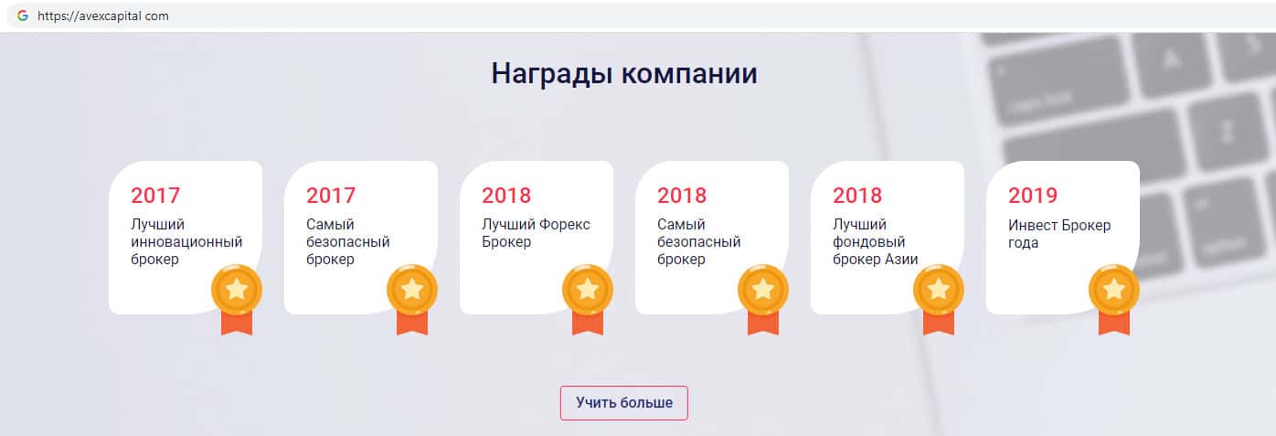 На официальном сайте скам-брокера AvexCapital отыскана информация, которая вероятнее всего не имеет никакого отношения к данной организации, а именно какие-то награды, а точнее изображение наград. Не верьте мошенникам Авекс Капитал и их якобы достижениям, они ничего не значат !!!