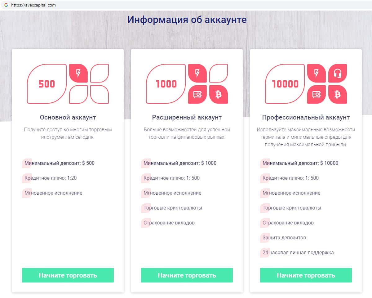 - Типы аккаунтов предлагаемых на интернет-сервисе шараги Авекс Капитал