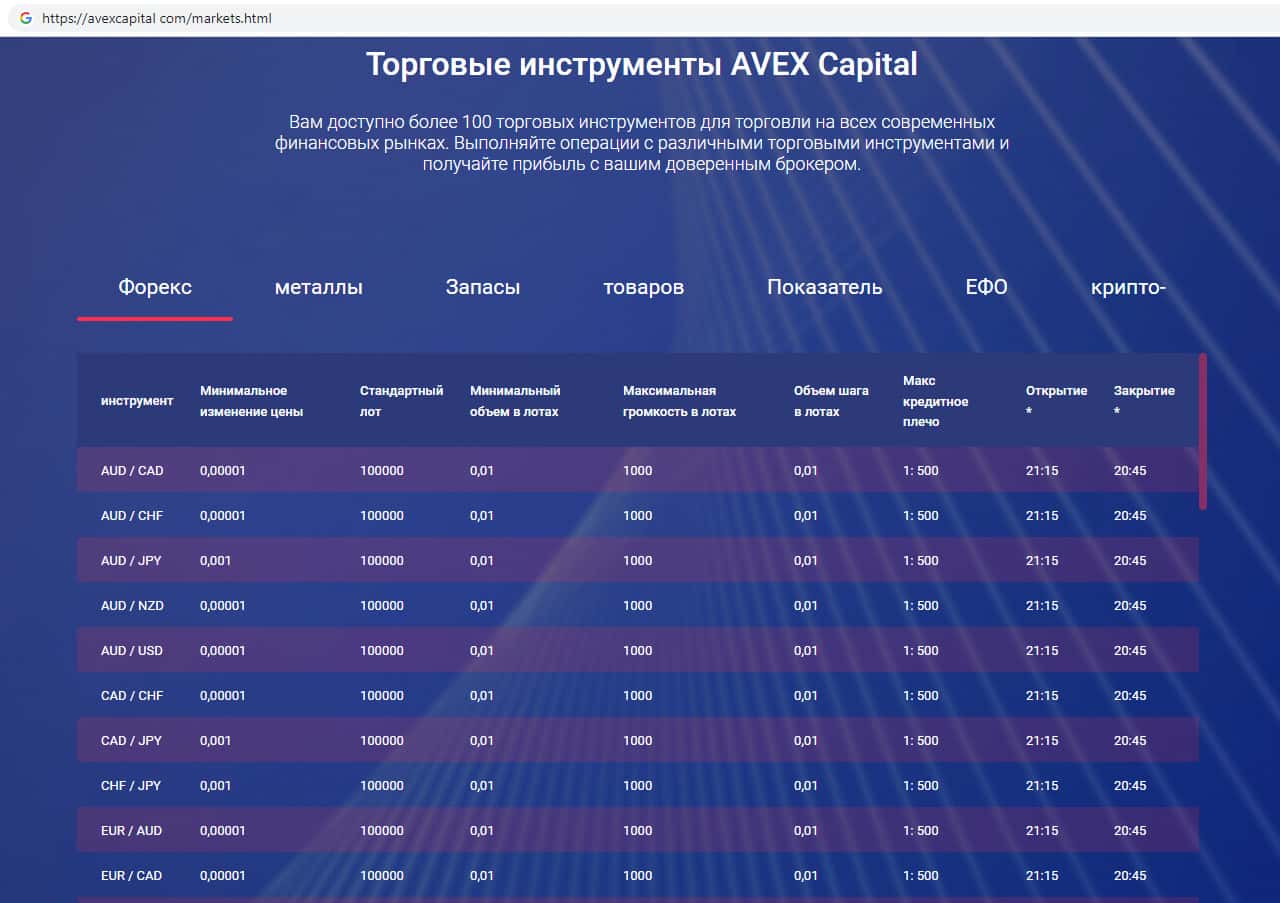 Торговые инструменты на сайте псевдо-брокерской конторы Авекс Капитал