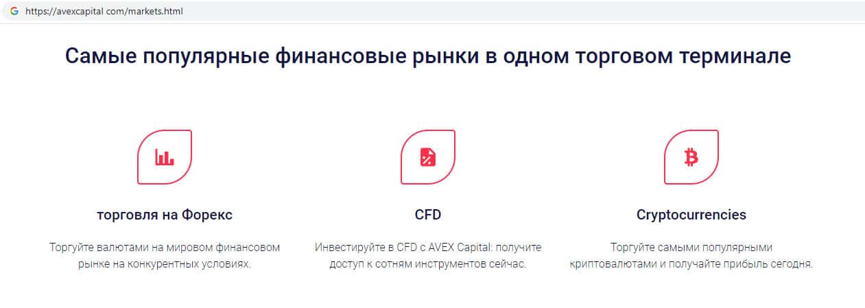 Здесь аферисты AvexCapital дают возможность пользователям сайта ознакомиться с перечнем торговых инструментов, с которыми якобы специалисты будут совершать сделки и зарабатывать Вам деньги. Верить в такого рода сказки скам-компании Авекс Капитал нельзя, поскольку похожая информация очень часто встречается на сайтах подобных скам-проектов.