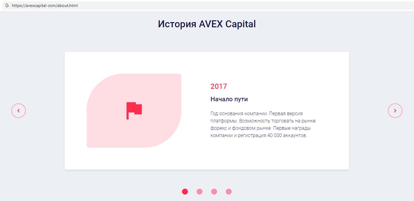 Жулики Авекс Капитал предоставляют возможность пользователям сайта ознакомиться с историей создания их организации. Подобные конторы зачастую используют данную ловушку рассказывая о том какие достижения были, и конечно же о том какой красивый у них офис. Верить мошенникам AvexCapital нельзя, а вкладывать свои деньги тем более !!!