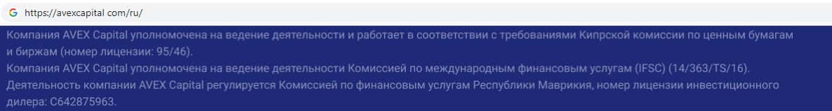 Вместо лицензии аферисты AvexCapital предлагают пользователю взглянуть на регистрационные номера. На самом деле данная мошенническая уловка рассчитана на невнимательного пользователя, поскольку если проверить, то возможно регистрации у конторы нет, а данная информация о регуляции компании является выдуманной.