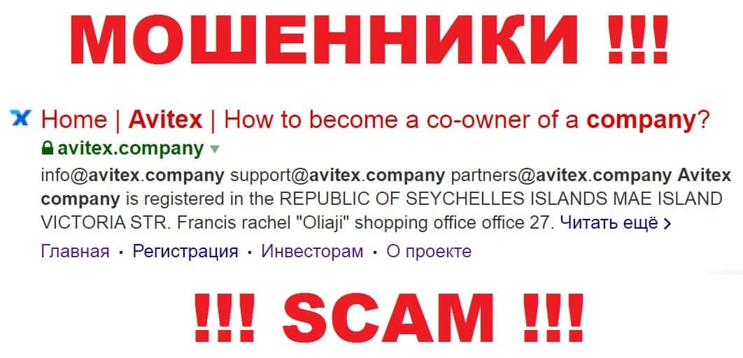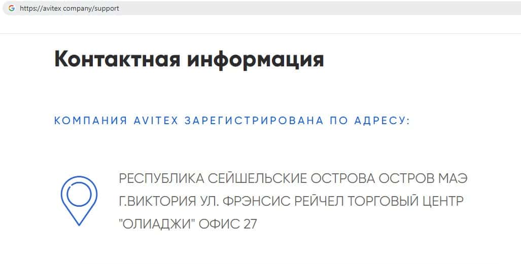 Компания финансовых мошенников Avitex Company на своём главном сайте указала, что зарегистрирована на Сейшельских островах, что лишний раз доказывает, что перед нами очередной оффшорный аферист.