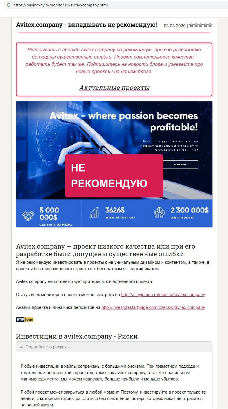 Интернет ресурс paying-hyip-monitor ru очень не рекомендует сотрудничать с конторой кидал Avitex Company, так как при её создании были допущены существенные ошибки, и такой вид деятельности несёт за собой большие риски.