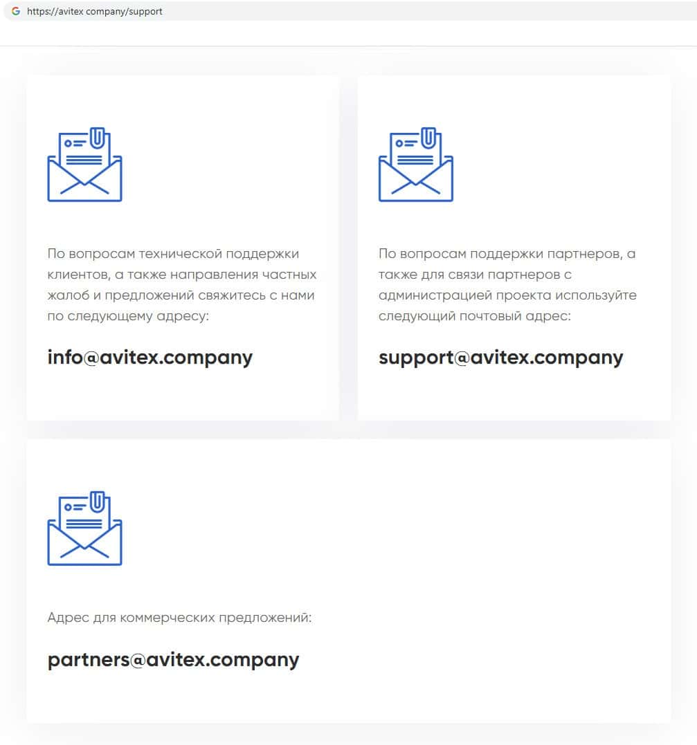 Компания финансовых лохотронщиков Avitex Company в качестве контактных данных представила лишь адреса электронной почты. Никакого номера для связи жулики не представили. Почта аферистов: