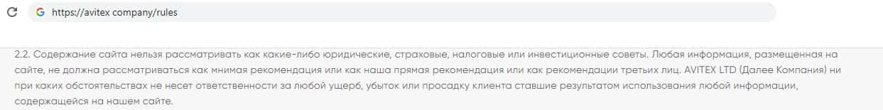 В своём клиентском соглашении компании жуликов Avitex Company указала, что нельзя рассматривать информацию на сайте как рекомендацию, хотя вся информация на сайте это призыв к инвестированию.