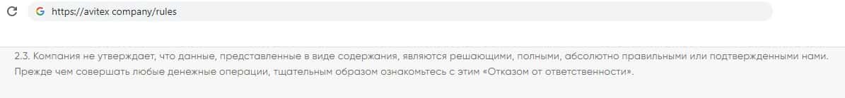 Далее компания кидал Avitex Company указала, что не отвечает за то, что информация предоставленная пользователям правильная, или подтверждённая.