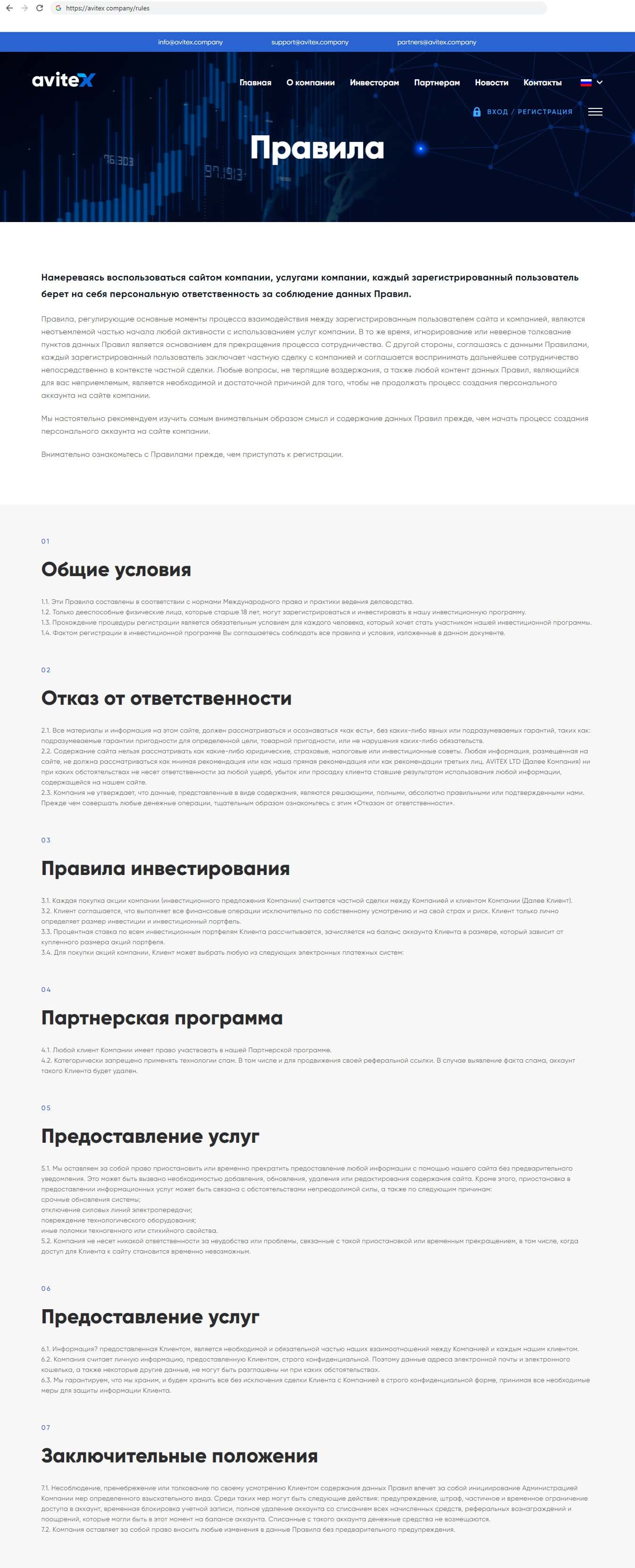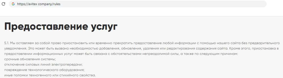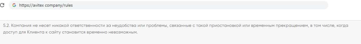 Так же разводилы Avitex Company снимают с себя ответственность за то, что из за остановки предоставления услуг сайтом клиент может понести потери.