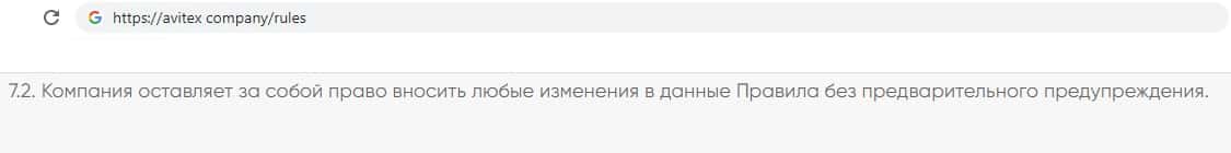 Напоследок компания финансовых аферистов Avitex Company указала, что может изменять своё соглашение в любой момент и без предварительного предупреждения пользователей.
