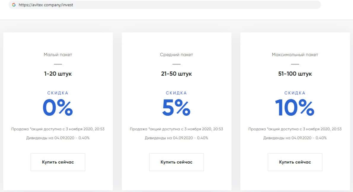 Финансовые махинаторы Авитекс Компани представили пользователям три пакета с акциями фальшивой компании, и по условиям аферистов, чем больше клиент купит тем больше скидка.