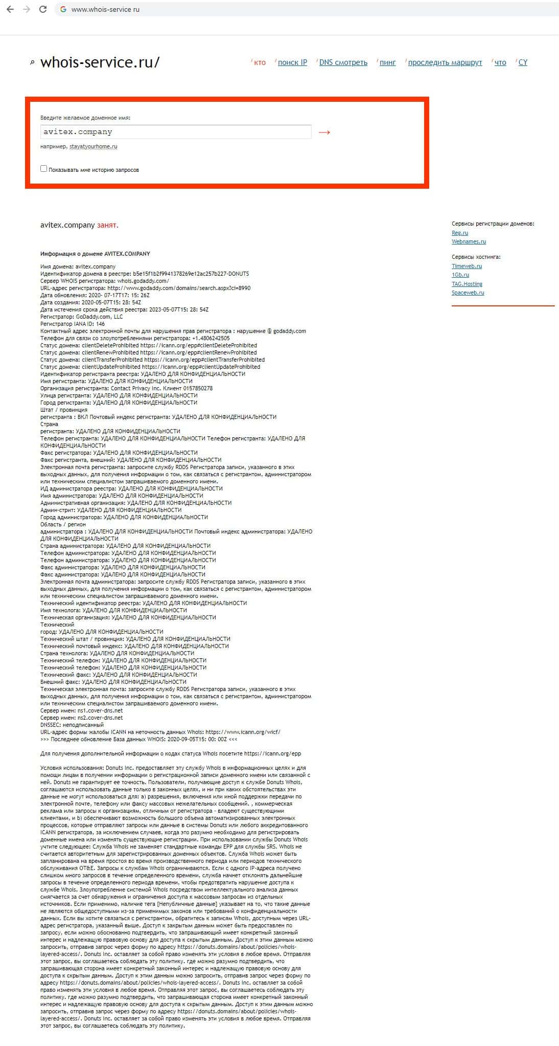 Через интернет ресурс whois-service ru мы хотели проверить информацию о владельце домена компании Авитекс Компани, но оказывается компания скрывает владельца своего домена.