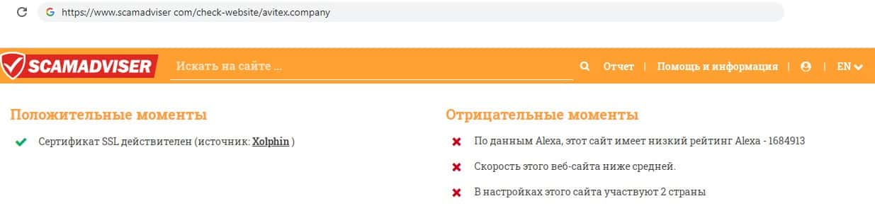 - Мнение интернет ресурса scamadviser com о лохотроне Avitex Company