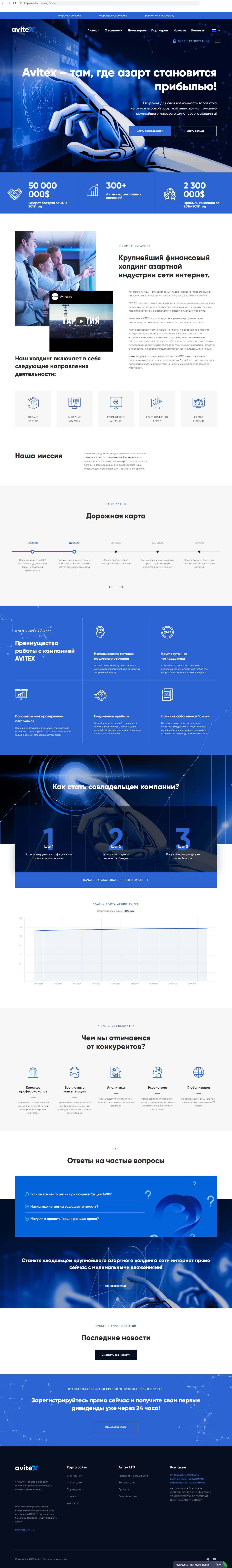 Главный сайт финансовых жуликов Avitex Company выглядит неплохо, но это всё, что есть у компании, по сути сайт шаблонный и создан для привлечения внимания наивных пользователей.