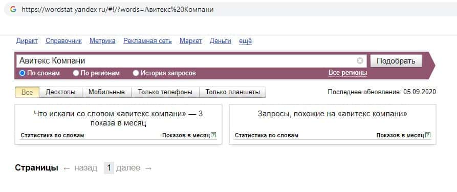 - Количество запросов компании разводил Avitex Company в Яндексе