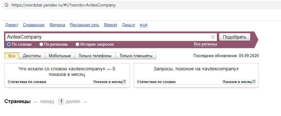 Затем мы проверили количество запросов компании разводил Авитекс Компани по русскоязычному названию без пробела, а именно "АвитексКомпани". Но результат оказался нулевым.
