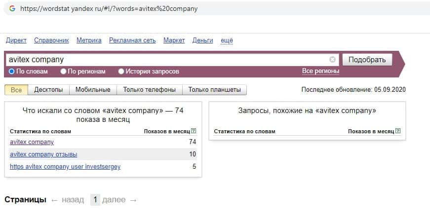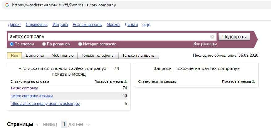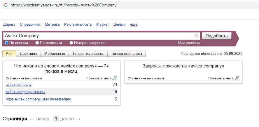Мы проверили количество запросов компании мошенников Avitex Companyв Яндексе по названию фирмы, а именно "Avitex Company". 74 раза пользователи выполняли данный запрос.