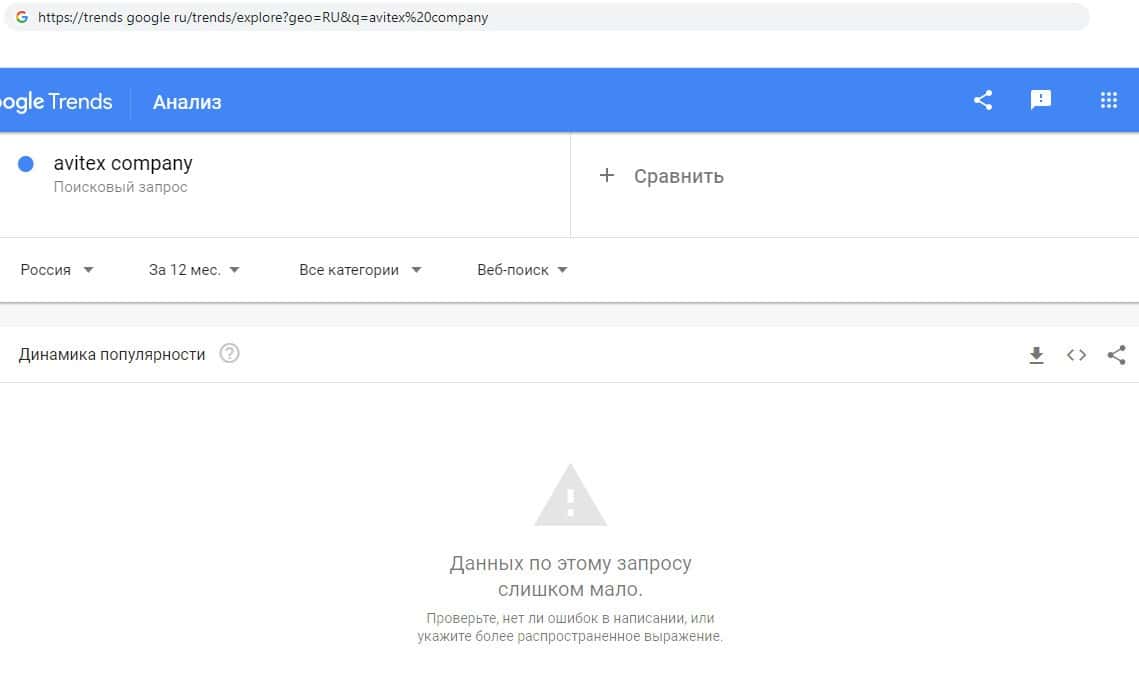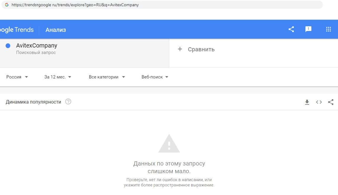 Мы проверили количество запросов компании Avitex Company в Google но названию фирмы, а именно "Avitex Company". Но данный запрос никто не выполнял в течении года.