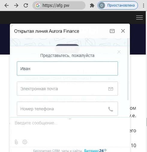 При открытии портала Аврора Финанс Групп довольно надоедливой оказывается его техническая поддержка, выраженная ботом онлайн-чата.