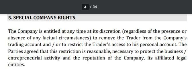 Пункт 5 Клиентского соглашения гласит, что компания имеет право в любой момент по своему усмотрению, без каких-либо оснований, заблокировать или удалить аккаунт трейдера.
