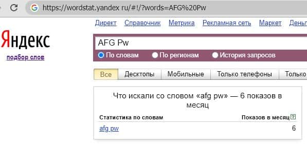 Количество брендовых запросов в поисковой системе Яндекса латинской аббревиатуры этого мошеннического проекта "AFG Pw" так и вовсе стремится к нулю.