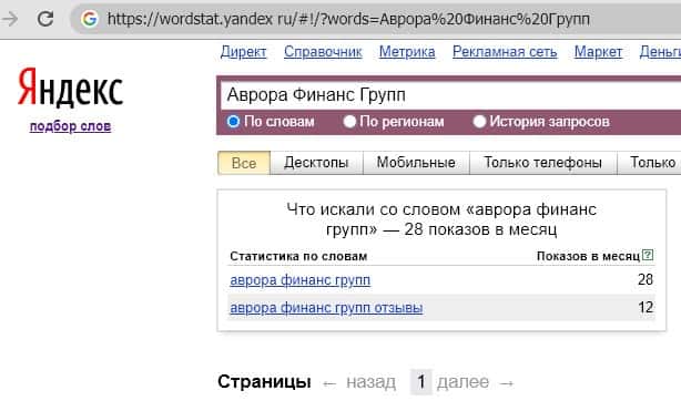 Количество поисковых запросов бренда "Аврора Финанс Групп" в системе Яндекса на уровне 20 в месяц подтверждает высказанный выше вывод о низкой популярности бренда.