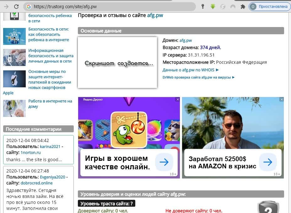 Те же результаты показывает и анализ поиска непосредственно сайта мошенников Аврора Финанс Групп "afg.pw".
