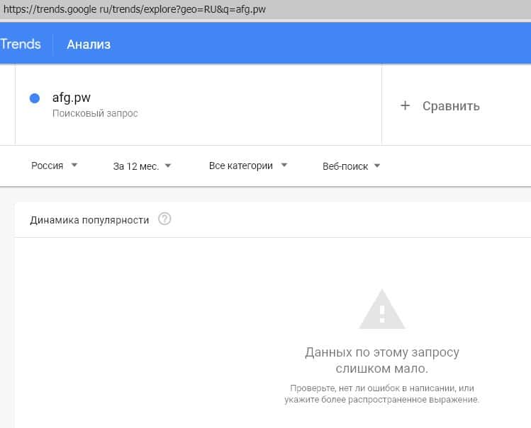 Недостаточное количество и поисковых запросов латинской аббревиатуры мошеннического проекта "AFG Pw" для их анализа и внятной интерпретации в системе Google.
