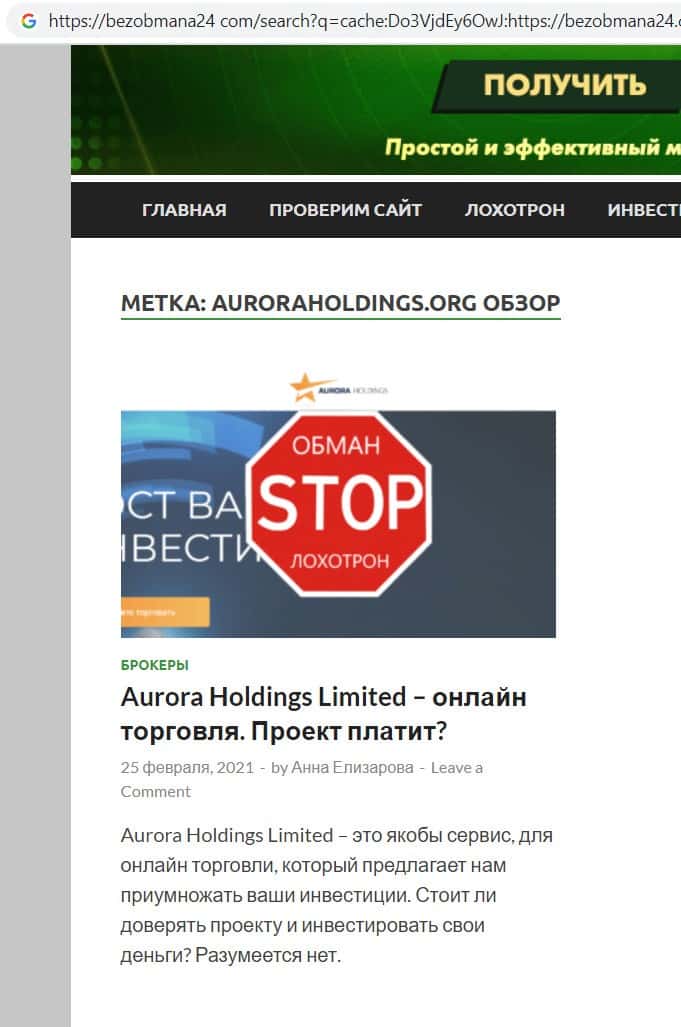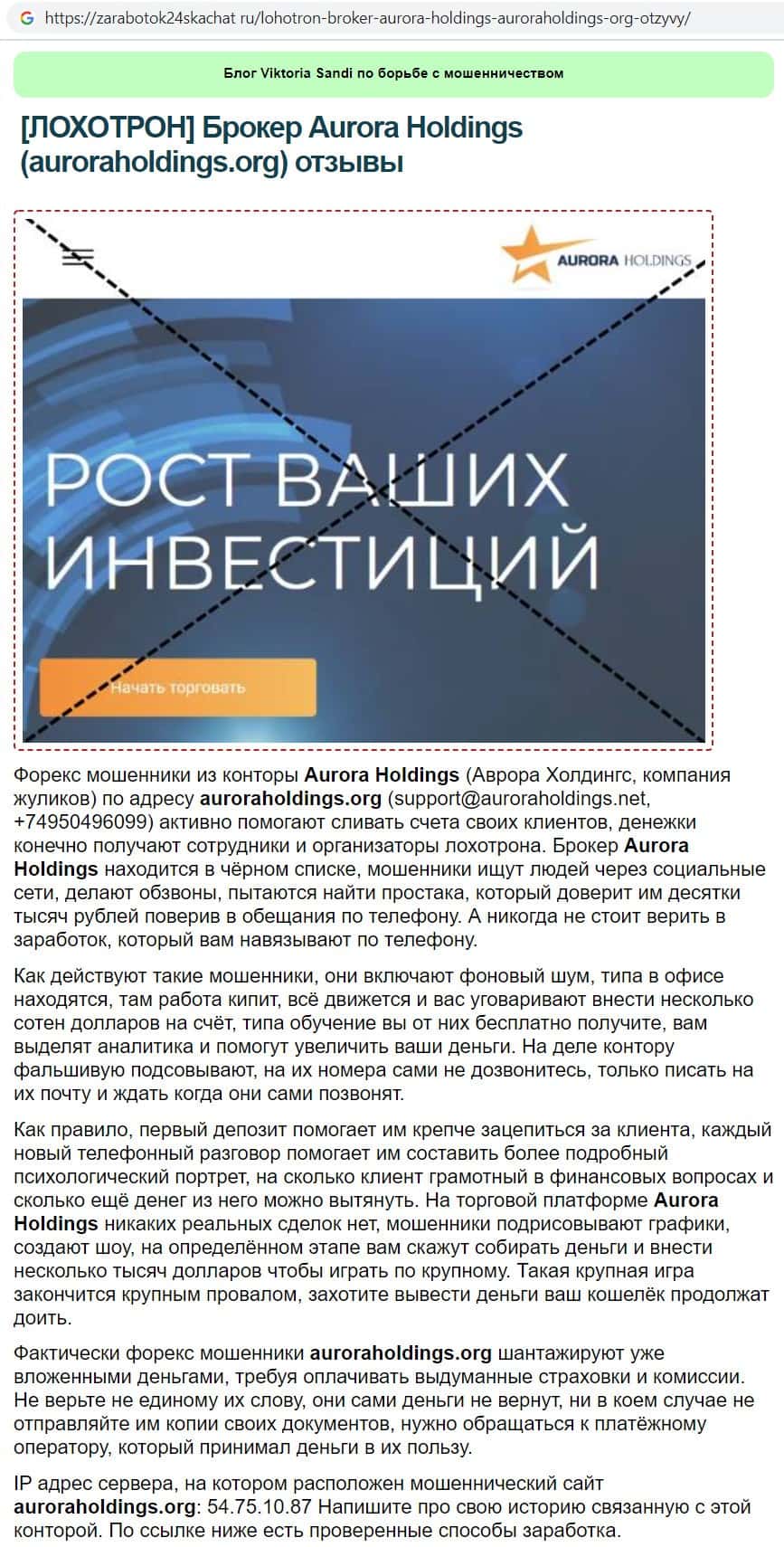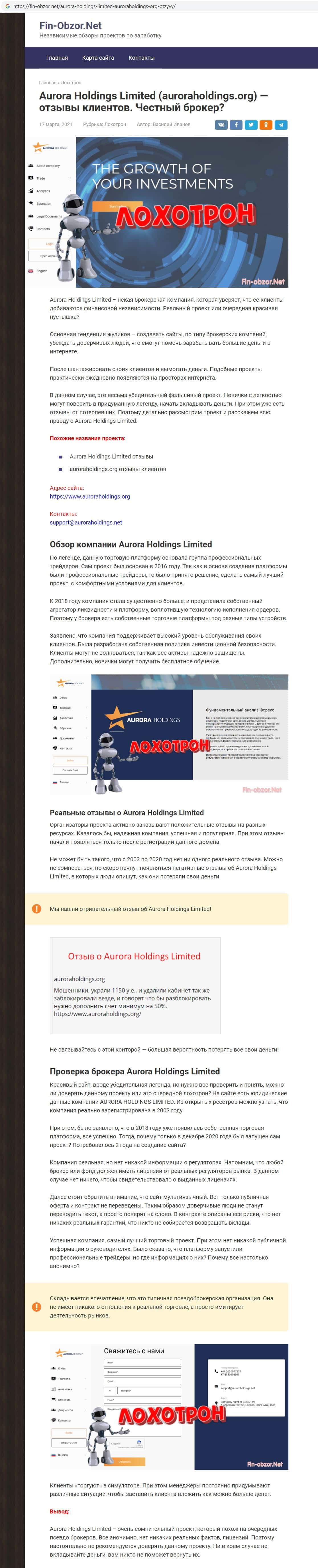 Интернет-ресурс fin-obzor net опубликовал статью, в которой сообщил, что компания AuroraHoldings Org очень похожа на мошенников, и ей не стоит доверять свои деньги.