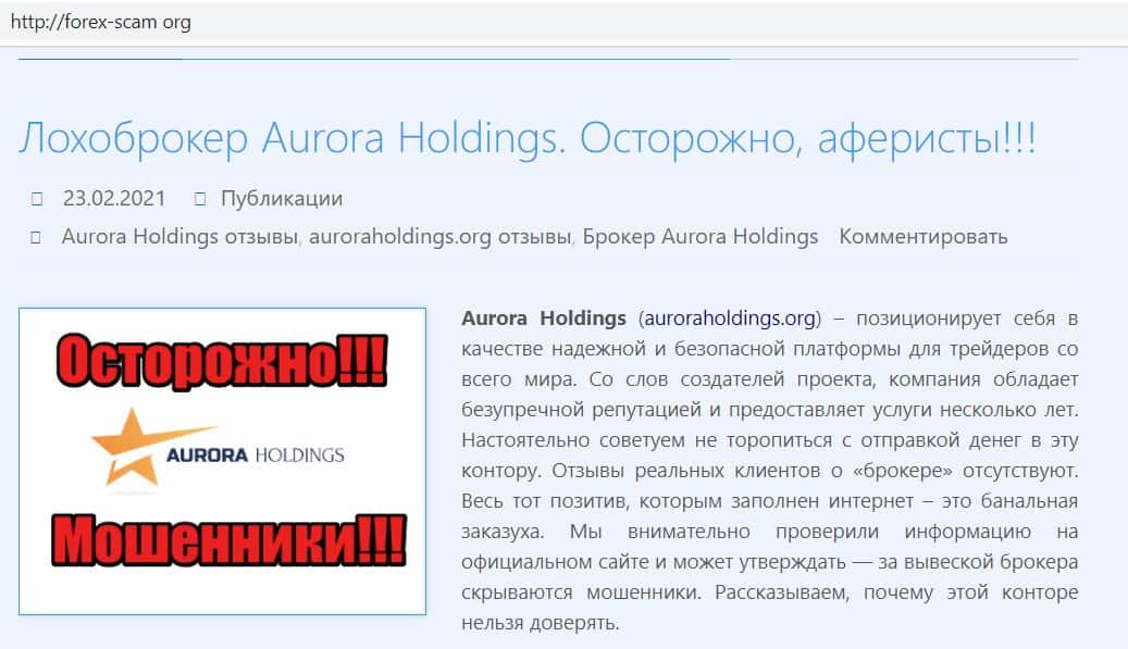 Далее представлена статья о мошенниках Аврора Холдингс, которая была создана авторитетным сайтом-разоблачителем Форекс Скам Орг.