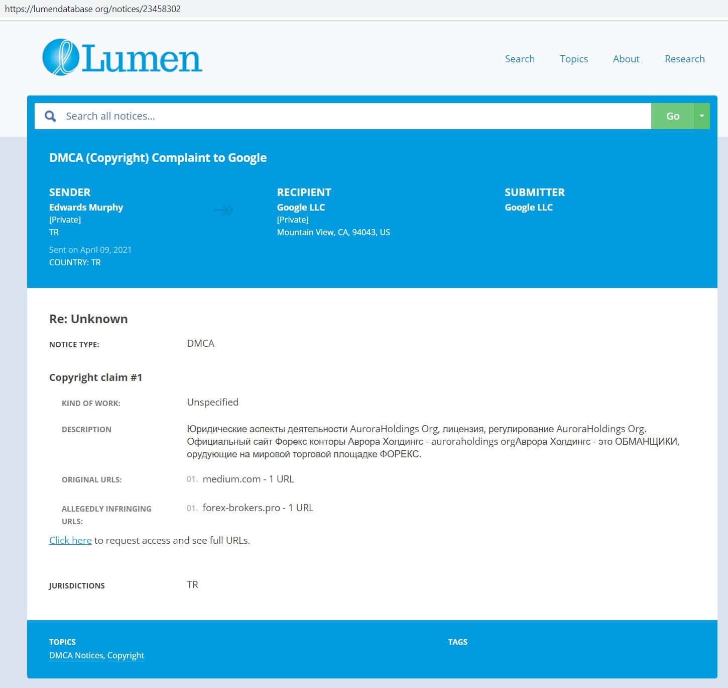 - Причина создания статьи о мошенниках AuroraHoldings Org - жалоба DMCA, поданная представителями лохотрона