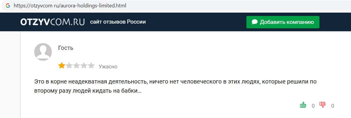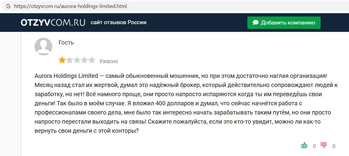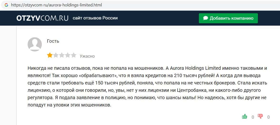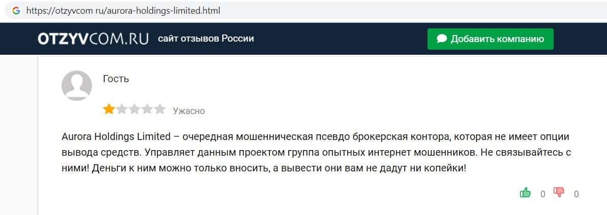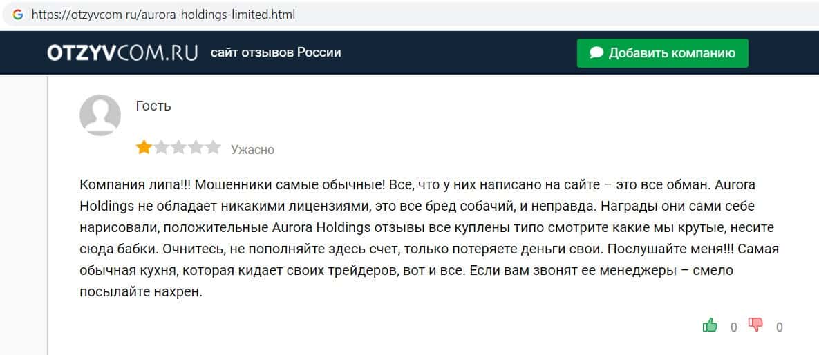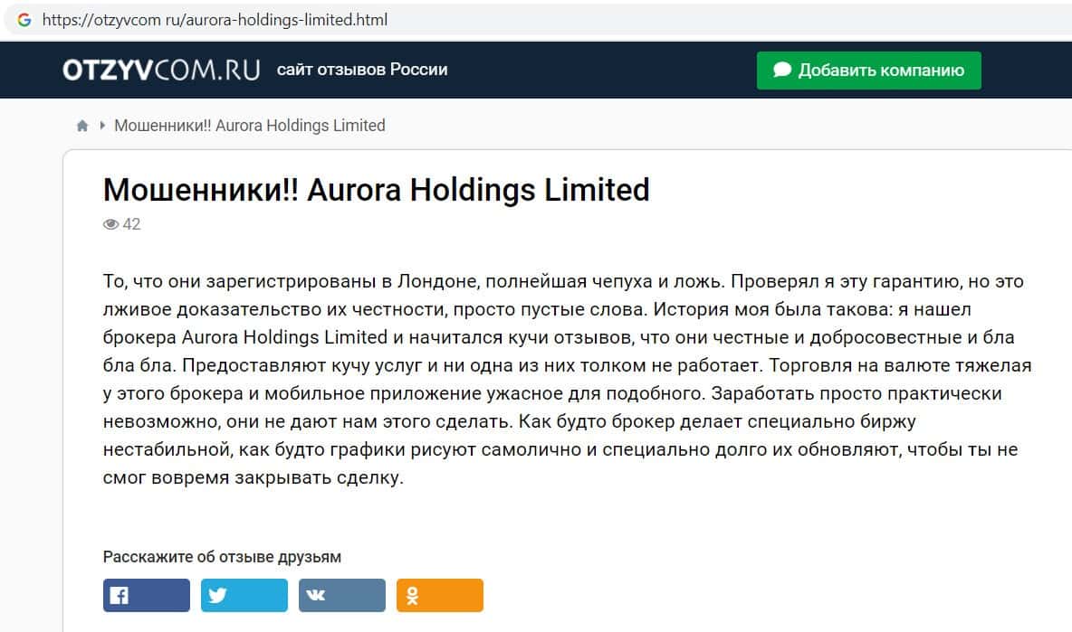 Так же сайт otzyvcom ru представил информацию о аферистах AuroraHoldings Org, в которой сообщил, что мошенники лгут о том, что зарегистрированы в Лондоне.