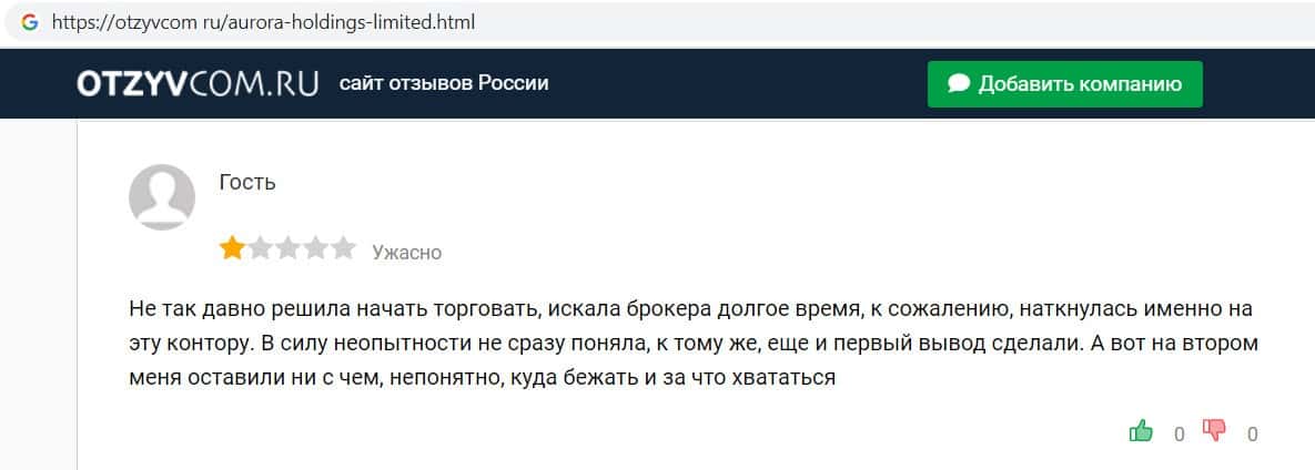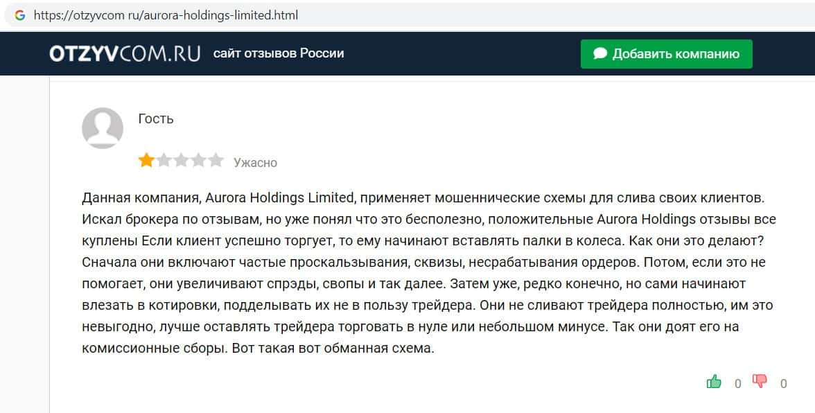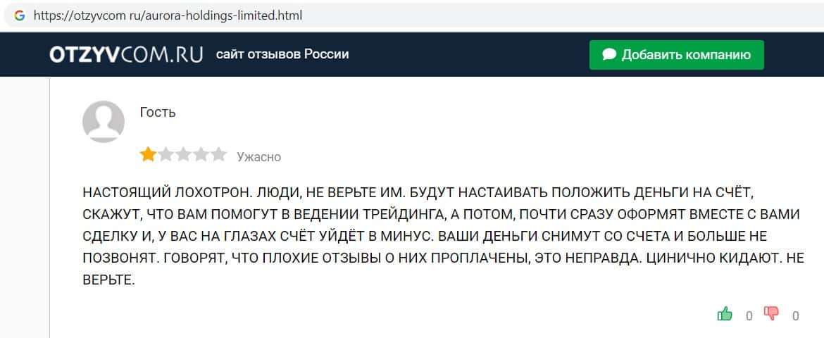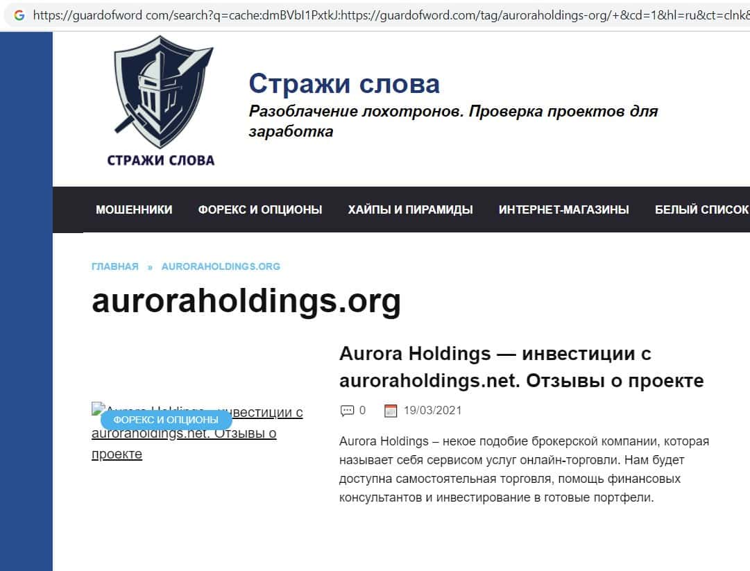 О фирме Аврора Холдингс написал и сайт guardofword com, который указал, что фирма является неким подобием брокера, который разводит наивных пользователей.