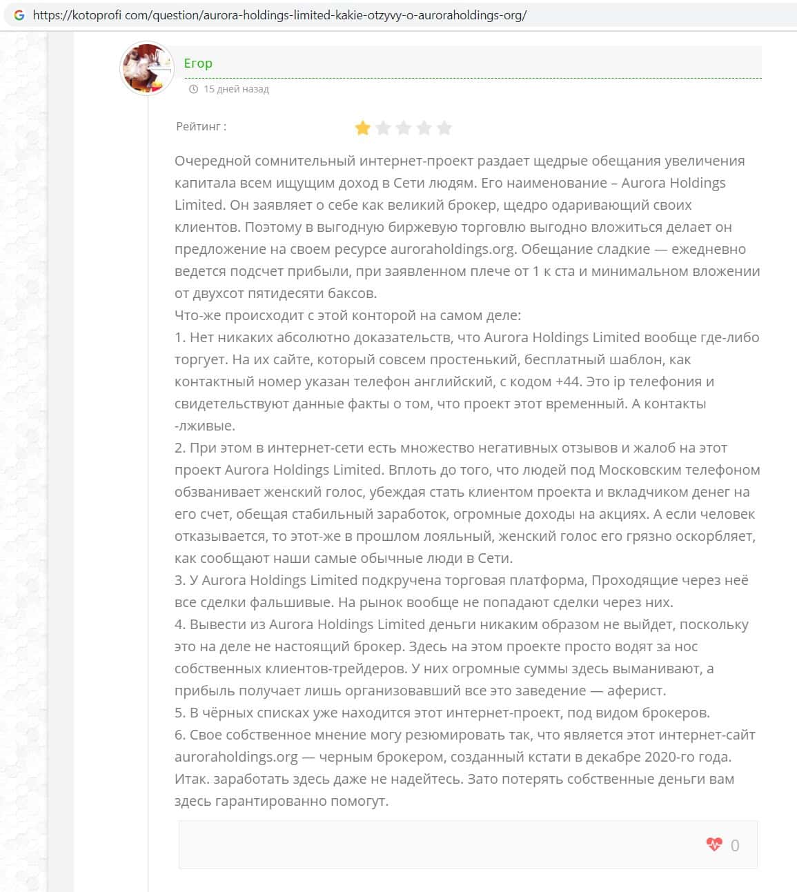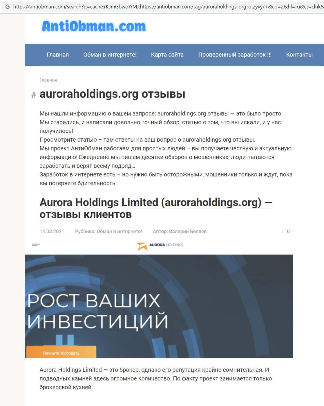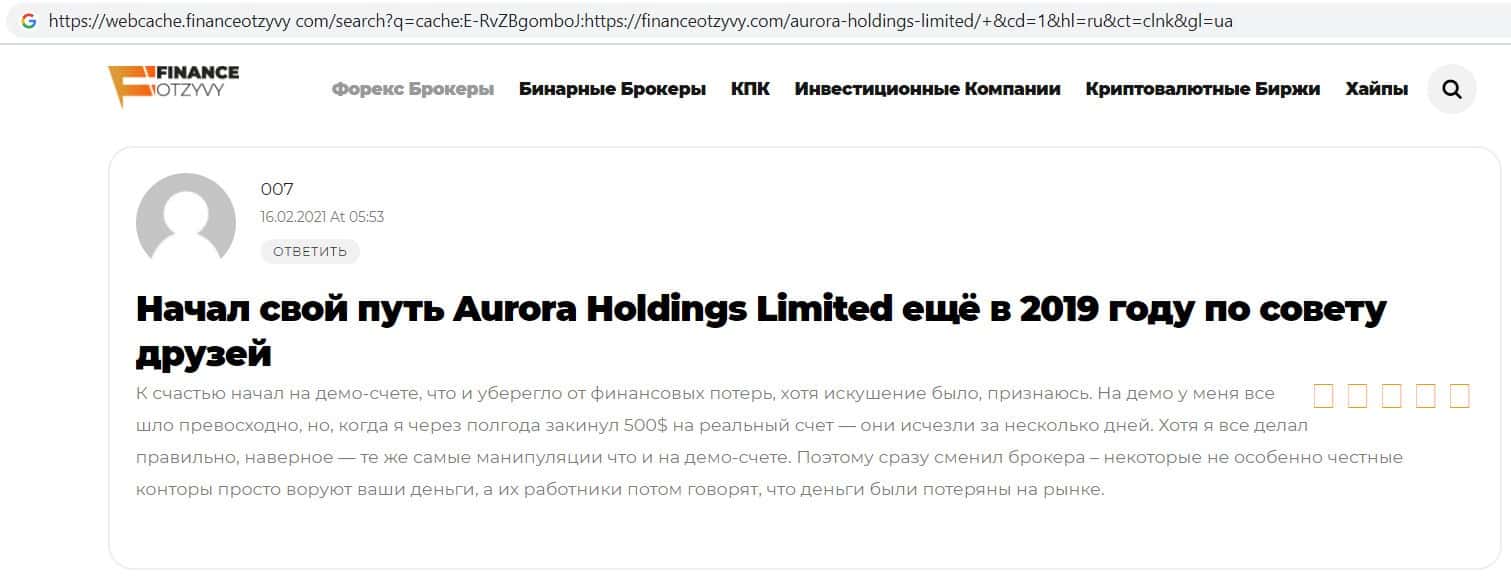 Так же большой обзор компании AuroraHoldings Org сделал сайт fxidea com, который пришёл к выводу, что фирма является мошенником, с которым очень опасно сотрудничать.