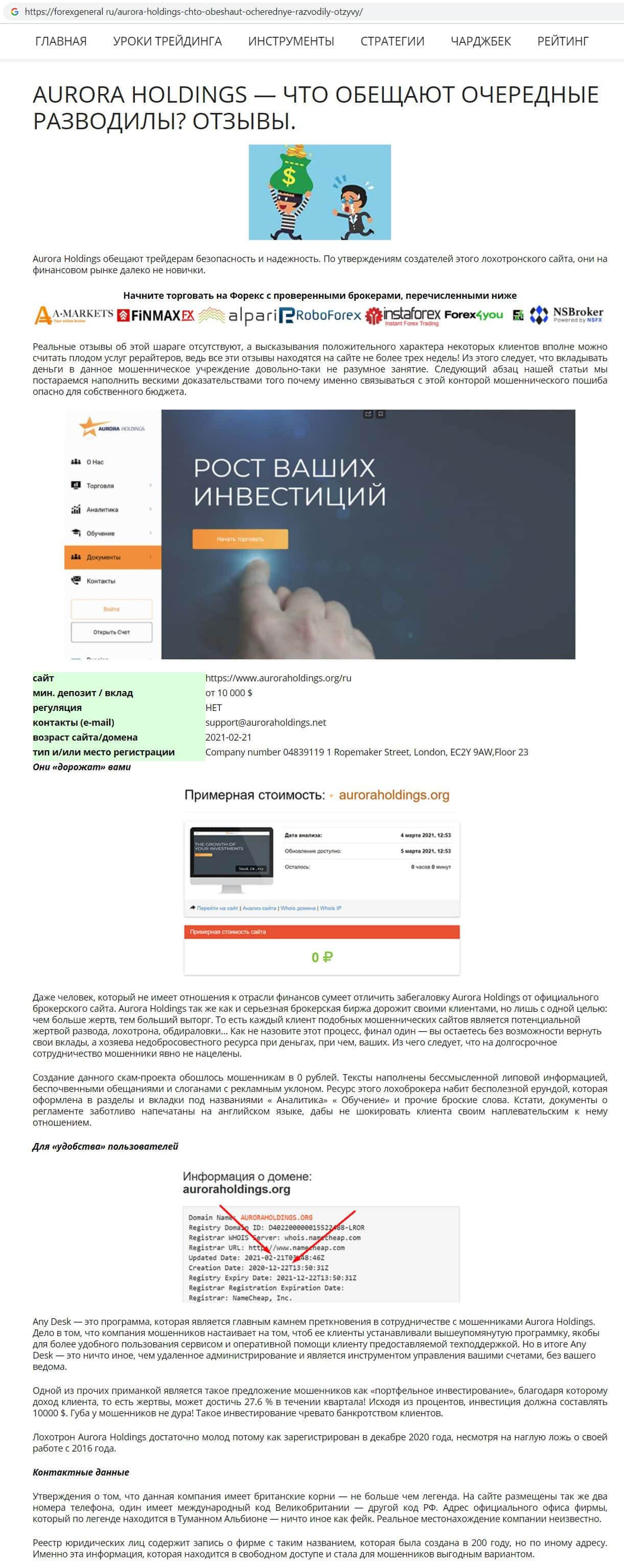 Так же сайт forexgeneral ru утверждает, что компания AuroraHoldings Org является лохотроном, который создали далеко не новички, а опытные финансовые мошенники.